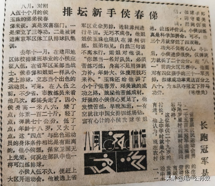 1984年至1985年的冬末春初,成了中国女排主力主攻手的侯玉珠,随队到漳州训练基地训练。无巧不成书,他的弟弟侯春俤也入选了福建省军区男排,也驻在漳州训练基地训练。姐弟俩排坛相见成美谈,共济奋斗为同行!中国女排教练邓若曾也很开心,他还送了签名排球赠送军区队,军区男排教练陈继共回赠军用伪装披风网,让邓教练上山打猎佩用。当时,侯春俤也打主攻,也发上手飘球。姐弟互帮互助,共同进步。后来,侯春俤也进了国青男排。再后来转业福建省体工队当教练,他训练徐云丽时,发现她主攻扣球时,天生动作大,耗能多,易受伤。经过谈心商议改成副攻,扣球动作无形中就变小了一些。从实践看,这一改位意义非凡。徐云丽成了三朝元老,若不是急性外伤,她参加东奥都有可能。