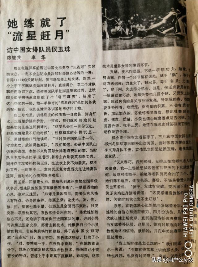 关于侯玉珠这两个神奇的发球,或者说四个发球。各种媒体上的描写和形容简直是太多了。有的说是“幻影游动”,有的说是“飞轮下坠”,有的说是“冲底沉球”……从技术上说,这种下沉飘球,是因为掌根突然击球即收,使球在飞行飘然中,最后顿失动力,产生下沉下坠。造成接球者误判错判,从而形成垫球失误失准。从文学角度上看,笔者更欣赏侯玉珠“珠落玉盘”之描绘,把人名珠与球若珠一语双关,把球场喻玉盘,绝妙!“流星赶月”之描写也非常形象生动,表现出球速动感,现场感极强,魅力无比,让人浮想翩翩!中国女排老一代队员,受日本大松博文教练影响,大多发勾手飘球。后来利用身高优势,大多发上手飘球。再后来,有了大力跳发。如今,上手跳飘成了主流。发球与一传,历来是一对矛盾。总体上两者平衡,侯玉珠成为秘密发球武器上场时,就打破了这种平衡。所以,这一点上,袁伟民用兵如神,大师也!
