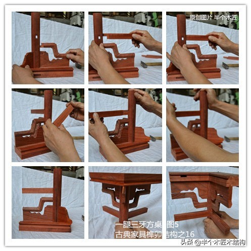 组装到到这一步,桌子的一角出来了,这就是用榫卯工艺制作家具的一个缩影,古代家具就是这么做出来的,老话说:摔断胳膊腿,也摔不断榫。不管古代现代,如果号称真正的榫卯家具,也应该是按这套榫卯构造的原理来做的,可现实情况就不多说了,是真用榫卯工艺做家具,还是用榫卯来宣传,业内人心里应该都明白。