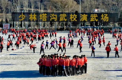 下午,正是塔沟武校的孩子们训练的时间,偌大的训练场上,成百上千的孩子们在拳打脚踢,格斗对抗,场面甚为壮观。这些孩子来自全国各地,从幼儿、少年到青年,各个年龄段的都有,幼小的还显得一脸稚气。