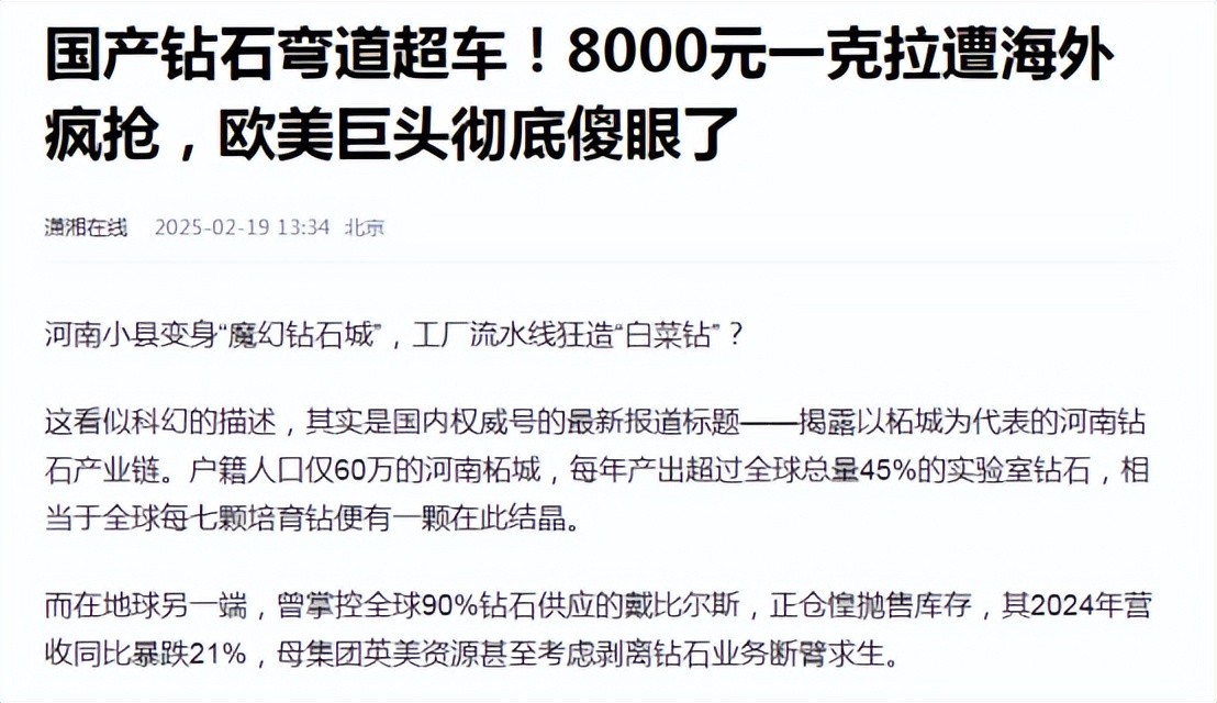 潇湘在线2025-02-19 国产钻石弯道超车!8000元一克拉遭海外疯抢,欧美巨头彻底傻眼了