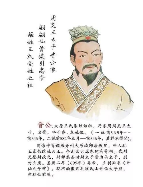 那么,太子晋又是怎样成为王姓人祖先的呢?在历史上还有不同的说法。其中较为可信的一种,是《新唐书》所记载的,即太子晋被废以后,他的儿子宗敬又在周灵王的朝中担任了司徒一职。当时人觉得他是王族的后代,便称他家为“王家”。