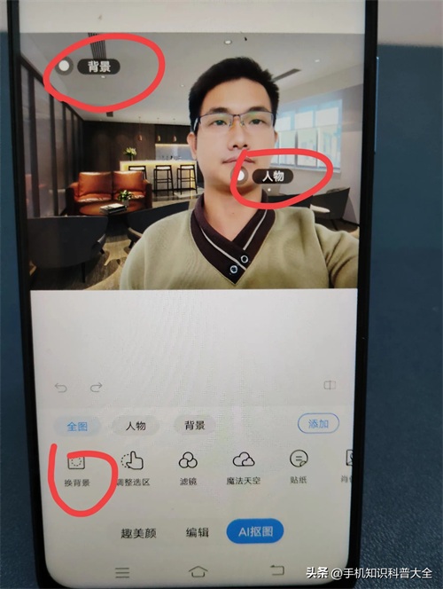 此时相册已自动帮我们识别出哪些是背景,哪些是人物。接下来要把背景去除,点击“换背景”操作。(如上图所示)
