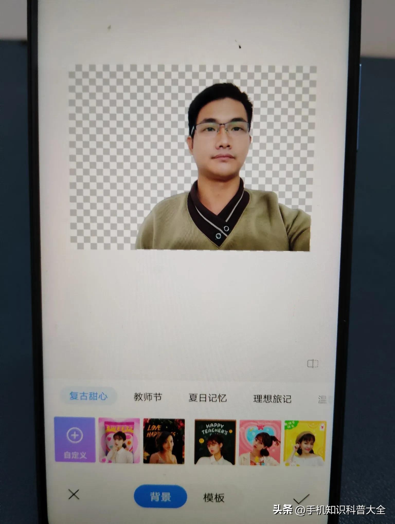 现在背景已完美去除,用的是黑白格填充。现在我们先试试系统的背景,看看自己喜不喜欢。要是不喜欢,最后再讲如何自定义勾选照片。(如上图所示)