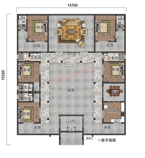 第三款:经典中式合院+舒适外廊+私密性好,6室2厅,砖混主体预算18.5万。