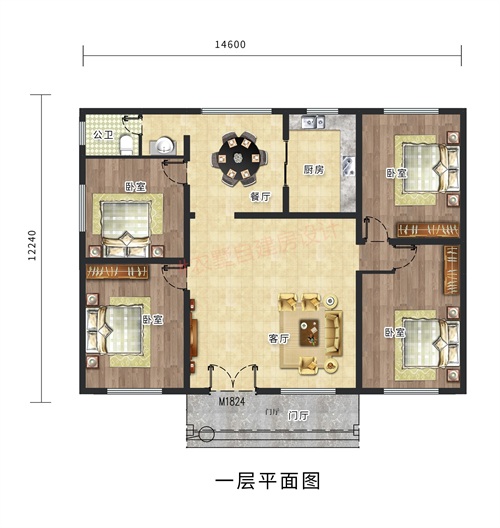 第一款:时尚长廊+门前小院+宽敞大堂屋,2厅4卧,砖混主体预算14万。
