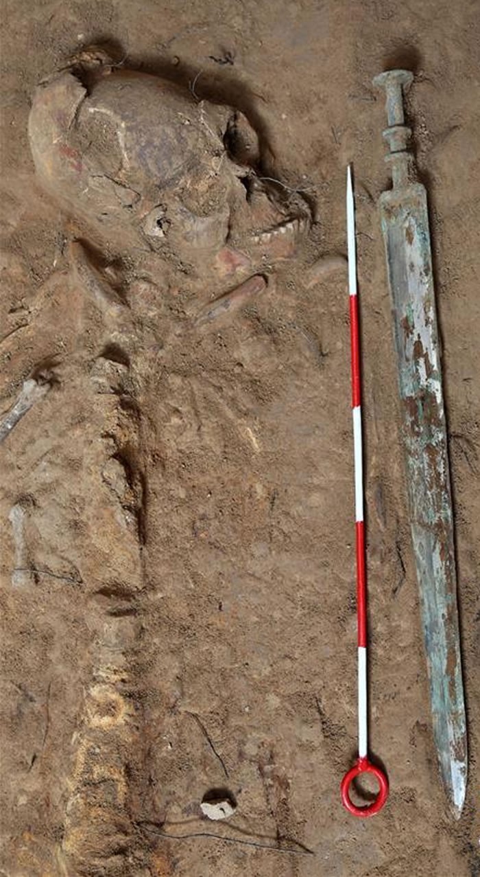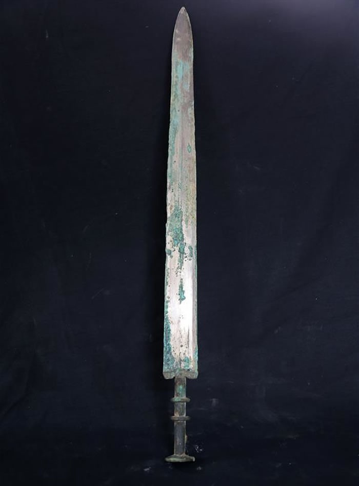此外该墓葬还出土一柄保存完整的铜剑。该柄长约60厘米的铜剑,剑身是中部起脊的八面体造型,近锋端有明显束腰,仔细观察,可发现使用之后在刃部留下的豁口,而铜剑的束腰和八面体剑身,则使其具有较强杀伤力。