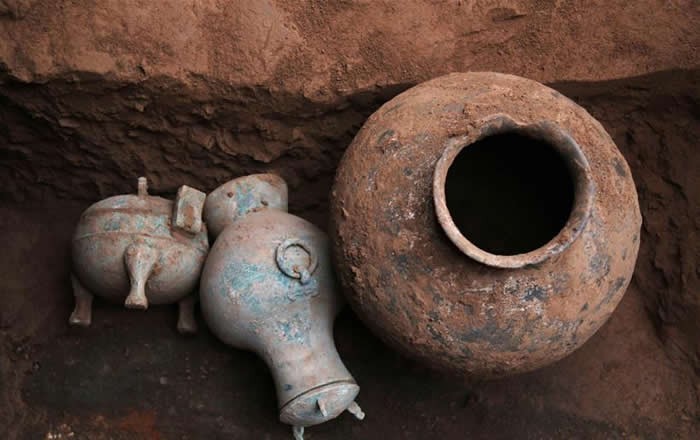 陕西发现秦人墓葬 出土两千年古酒完整铜剑