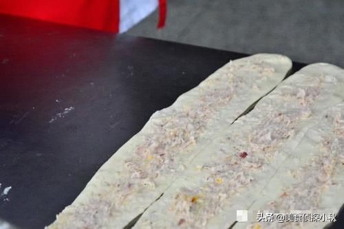 这还不算完,还要再次擀开,铺第二层肉,不然吃起来就不够味。