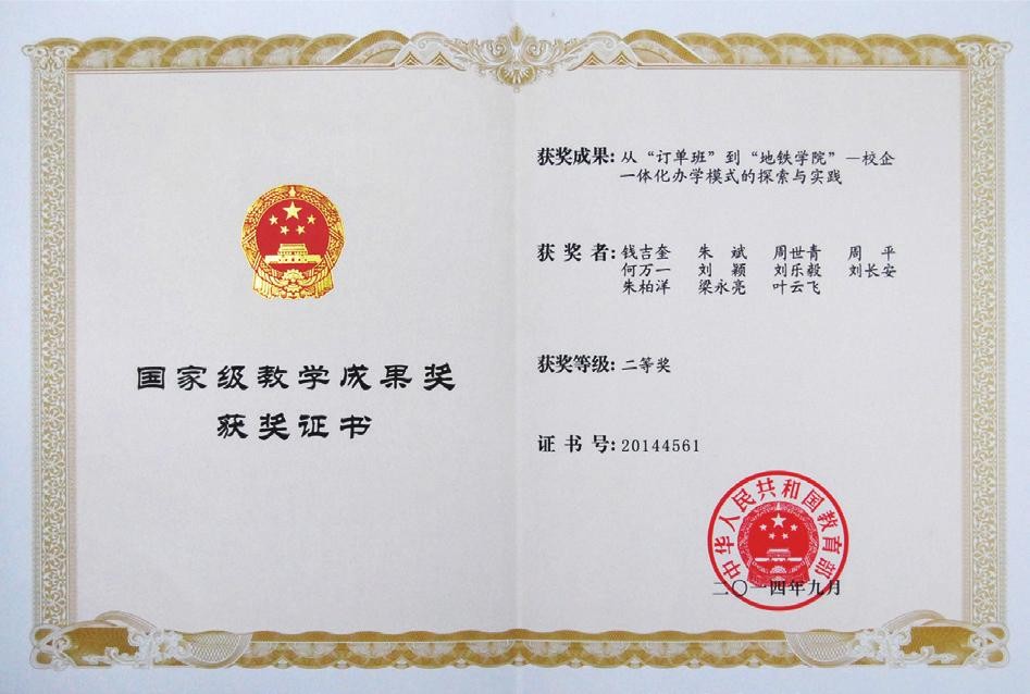 《从“订单班”到“地铁学院”——校企一体化办学模式的探索与实践》获国家级教学成果奖二等奖