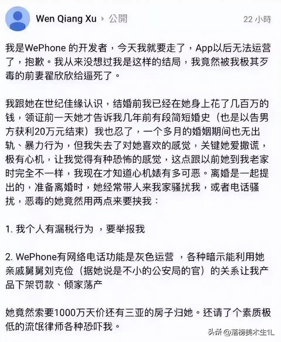 并且在他自杀的前一天,还曾在自己的社交账号上写道:“我是WePhone的开发者,今天我就要走了,App以后无法运营了,抱歉。我从来没想过我是这样的结局,我竟然被我极其歹毒的前妻翟欣欣给逼死了。”