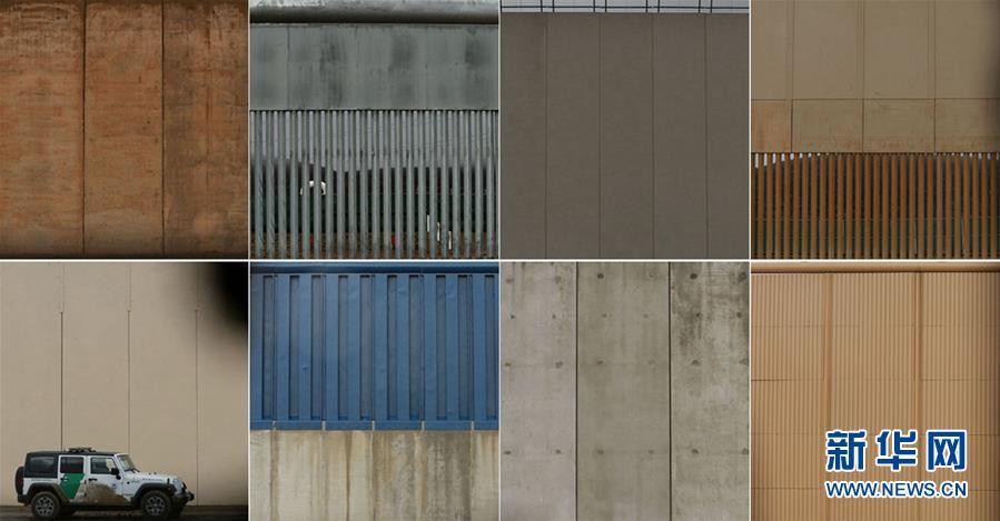 这张拼版照片显示的1月10日从墨西哥蒂华纳一侧拍摄的美国境内的8块“样板墙”。