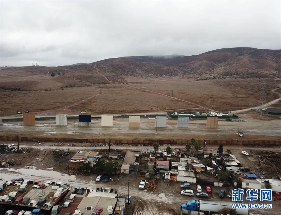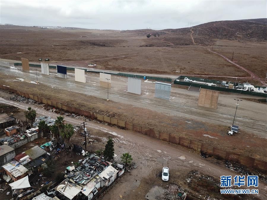 这张1月10日从墨西哥蒂华纳一侧航拍的照片显示的是美墨边境上的原有隔离墙和美国境内的8块“样板墙”。