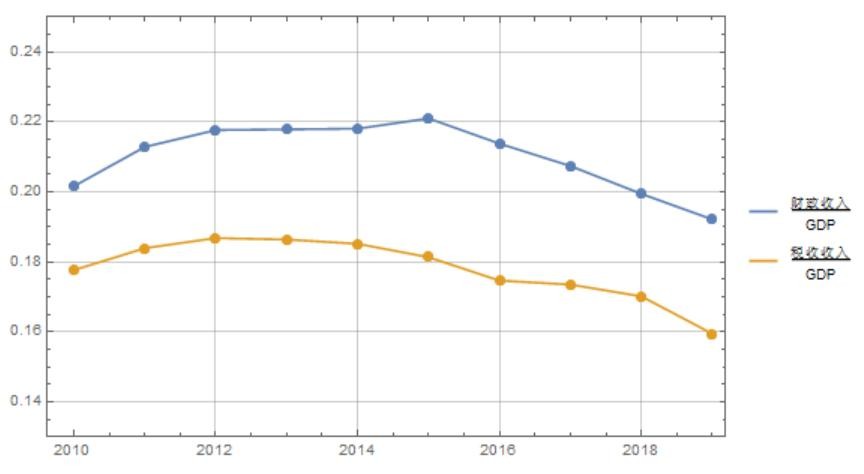 过去十年财政收入及税收收入占国内生产总值的比重