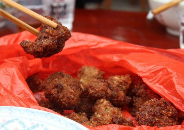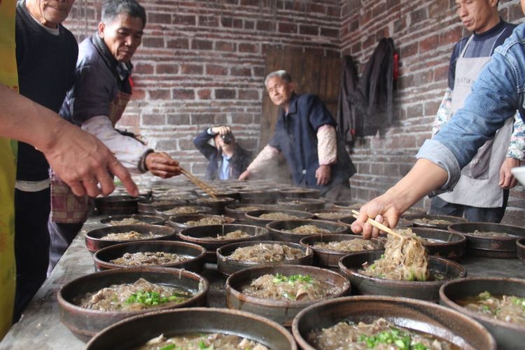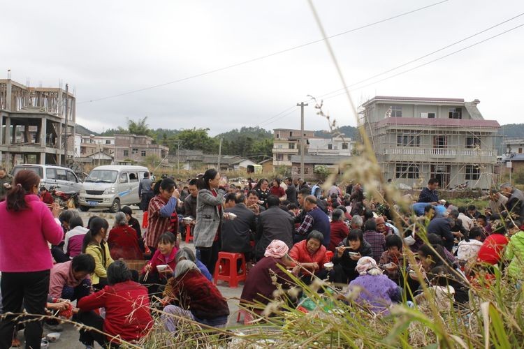 一大早,三个村的村民都赶过来参加庙会,不一会就热闹起来了,村民们各司其职,齐聚一堂,手持饭票,拥簇欢闹,用丰盛的菜肴庆祝,祈求风调雨顺,五谷丰登。