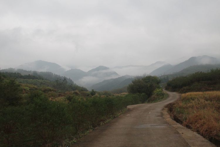 清晨的山间弥漫着浓重的雾气,乡道一旁种植着桃树,为这即将进入隆冬的季节增添了一份新意