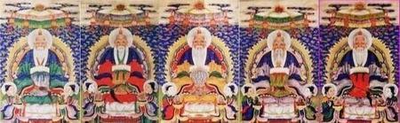 还有说法,比如,东方青灵始老天尊,为木帝,泰山神仙。中央元灵元老君,为土帝,嵩山神仙。西方皓灵皇老天君,为金帝,华山神仙。南方丹灵真老天君,为火帝,衡山神仙。北方五灵玄老天君,为水帝,恒山神仙。
