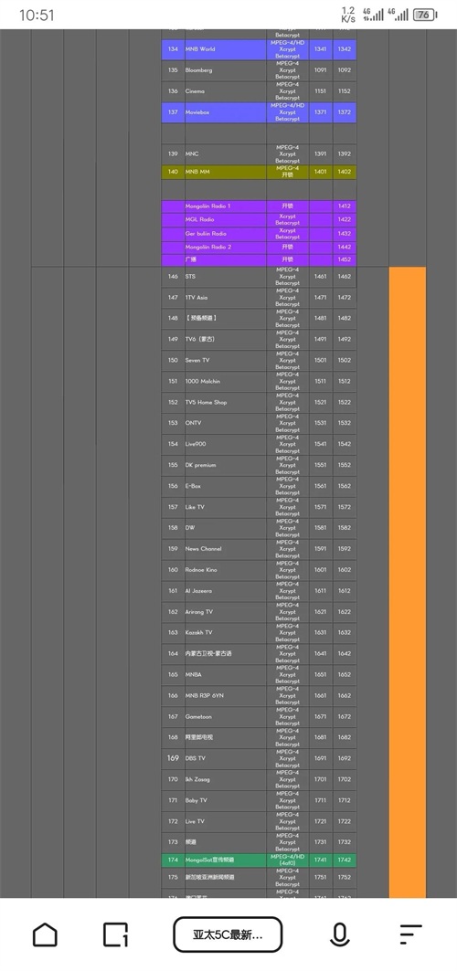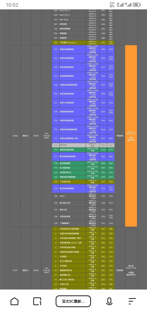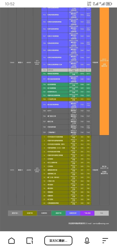 目前我看该卫星也已经退役了,取而代之的是亚太5C号卫星,该卫星正直壮年,目前看所有的电视频道视频格式都改成了MEPG4视频格式 了,对于我们其实不算是特别友好,毕竟我们现在家里压箱底的机子大部分都是只支持MEPG2视频格式的,所以想领略一下风采,还得投资一下,小编家住6楼,如果大家想领略这些节目的风采,等小编的粉丝超过1万可以给买一套设备回来接收一下大家想接收的卫星,来寻找曾经的快乐。最后附上138卫星目前的节目和卫星参数