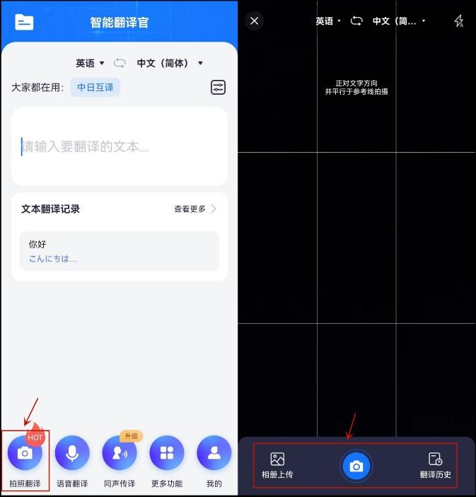 如果需要拍照翻译,仅需轻触应用程序左下角的“拍照翻译”按钮,即可进行拍照或从相册上传需要翻译的图片;