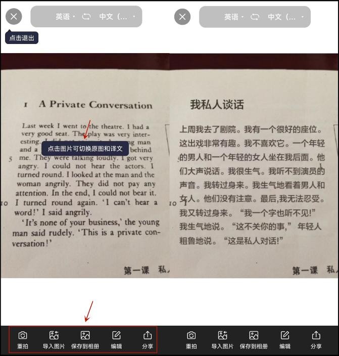 接着系统会自动进行处理,只需等待3秒钟即可,翻译完成后,还可以选择重拍、保存、编辑和分享,非常方便使用。